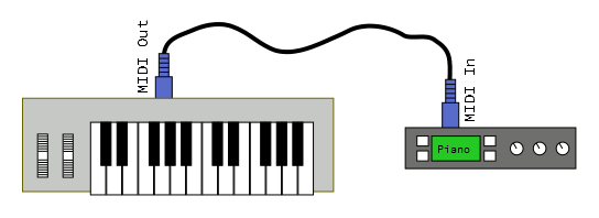 In this example, the MIDI out of a controller is connected to the MIDI in of a tone generator module. It allows the player to use the keys on the controller to play sounds from the module. The controller sends note-on, note-off and controller messages, to be interpreted into sound by the module. The communication path is unidirectional.If the module is multitimbral, it can be set to respond on several MIDI channels, allowing the player to switch between sounds by changing the transmission channel.